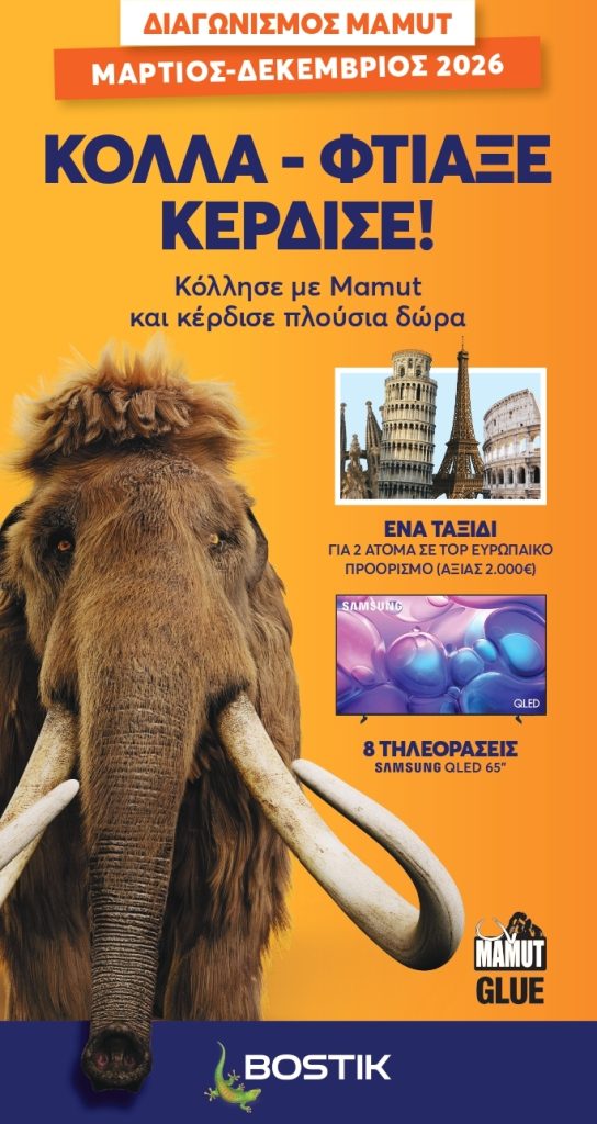 Η Bostik σε συνεργασία με τα «μαστορέματα» παρουσιάζουν τον διαγωνισμό «Mamut Glue – Κόλλα · Φτιάξε · Κέρδισε», αφιερωμένο σε όσους αγαπούν να δημιουργούν, να επισκευάζουν και να δίνουν πρακτικές λύσεις στην καθημερινότητα.